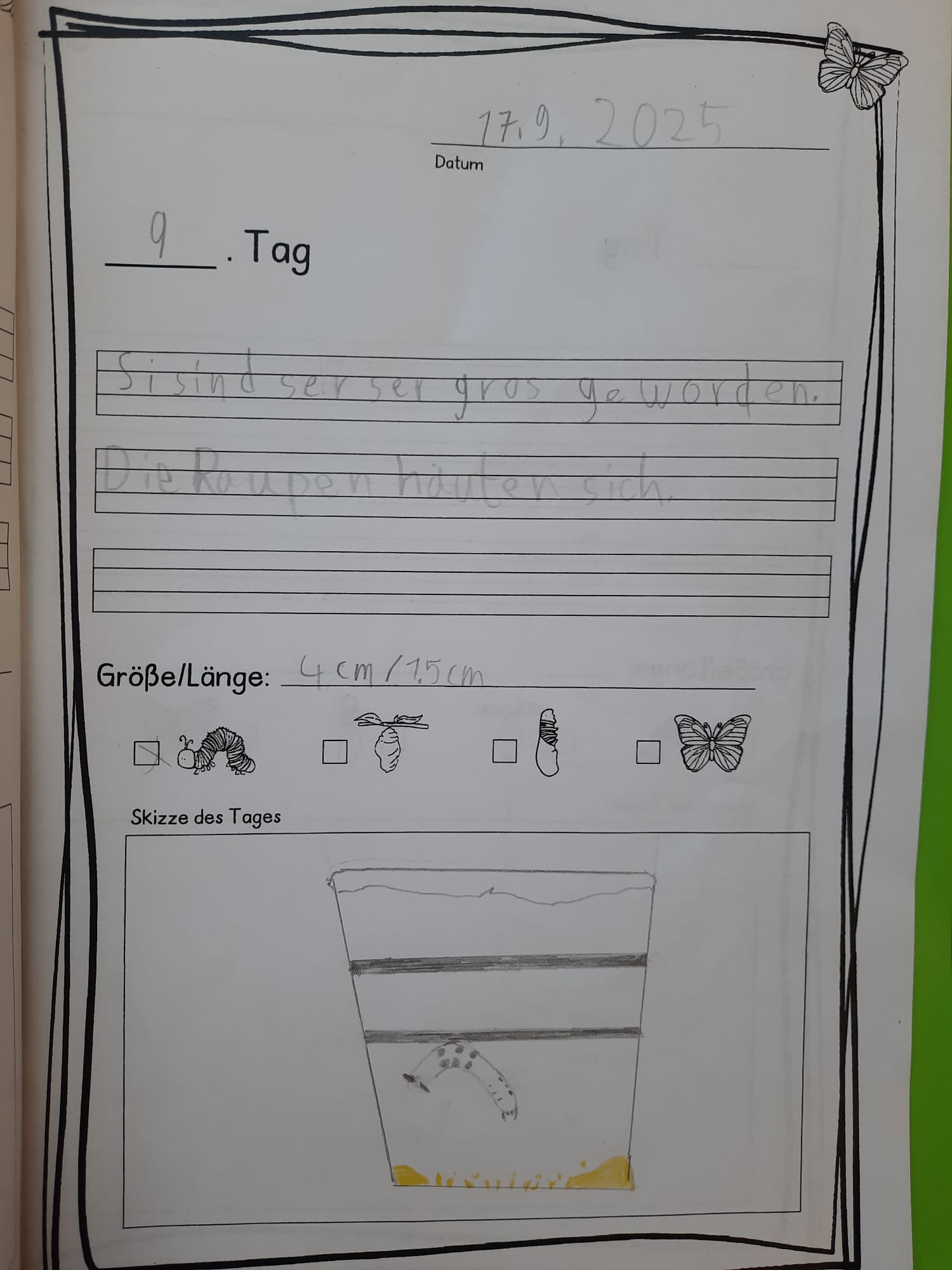 Im Englischunterricht sammelten die Kinder englische Wörter rund um den Schmetterling und in Mathematik wiederholten sie das Messen in cm und mm sowie das Erstellen von Tabellen anhand des Wachstums der Raupen.